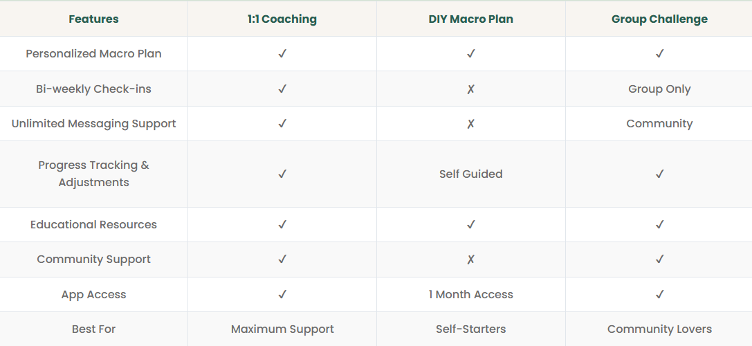 | Features | 1:1 Coaching | DIY Macro Plan | Group Challenge |